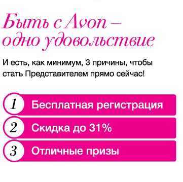 Стать представителем Avon выгодно! Вы хотите достигать успеха, зарабатывая с нами, распространять Эйвон или если Вы просто хотите заказывать для себя со скидкой до 31%, получать подарки и приобретать продукцию по выгодным предложениям? Это легко - регистрация и доставка практически по всей России бесплатная*, продукция приходит в удобное Вам отделение почты. Никаких первоначальных вложений!- оплата производится после получения продукции. Заказать Avon можно несколькими способами - через Интернет, через смс-сообщение, через автоматическую информационную систему (звонок бесплатный). Обучение также бесплатное - Вам гарантируется бесплатная профессиональная помощь и поддержка на всех этапах работы, в каком городе России Вы бы ни находились.